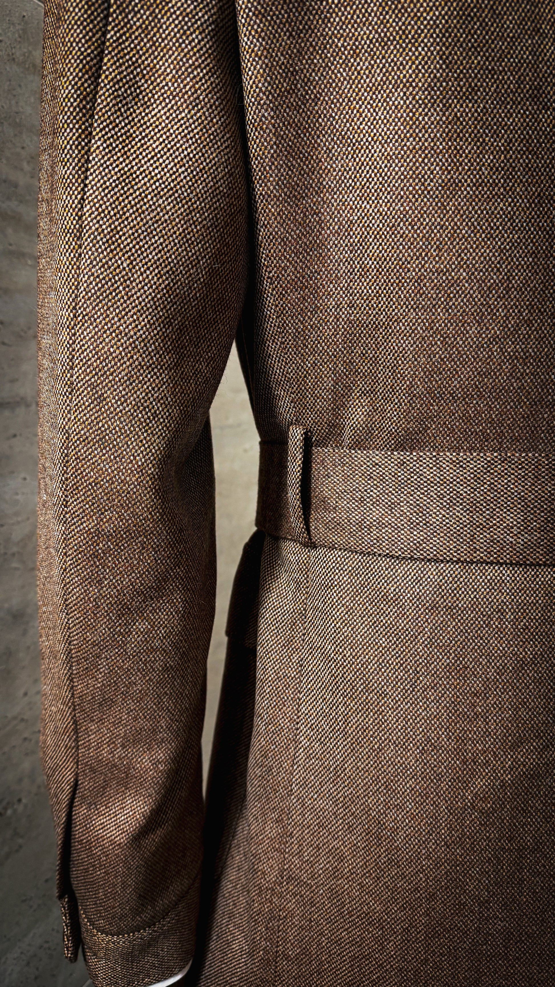 Confectionnée dans une laine "grain d'orge" aux tons chauds, elle offre légèreté, respirabilité et tenue impeccable, idéale aussi bien pour les journées urbaines que les escapades en pleine nature. Cette saharienne est une pièce signature — à la croisée du style utilitaire et du raffinement sur mesure.